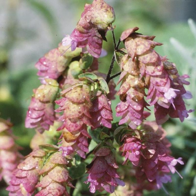 Rosy bracts make pendulous flowers resembling Hops. Prized as dried flowers. Origanum Kent Beauty is tolerant of full sun with lush silvery foliage that remains attractive all summer. Long blooming, the foliage has a spicy aromatic scent.