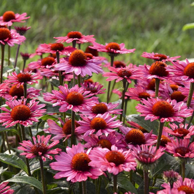 'Coral Craze' has large, 5" vibrant coral pink flowers mature to lavender pink with wide petals. Dark, near black stems have a matching dark cone. The tallest of the collection. The dried seed heads also provide architectural interest in the winter.