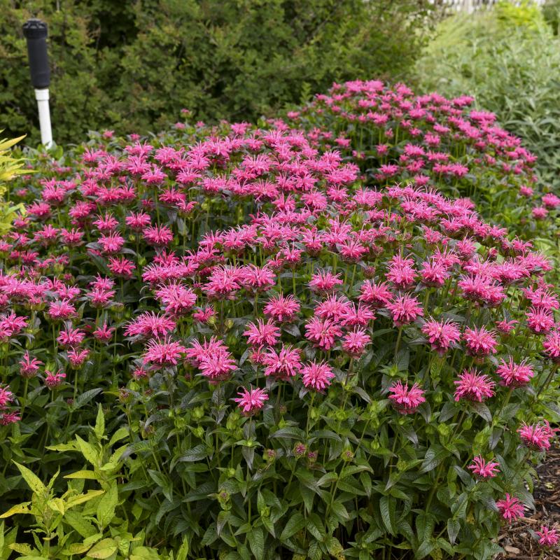 'Pink Chenille' has large, 3½" fluorescent pink flowers have lighter pink interiors for a two-tone effect. This series is excellent for landscape plantings and filling space in the middle of the border. Well branched stems support a second flush of flowers that extends the length of bloom, a trait that will delight both gardeners and the bees who frequent this popular pollinator perennial. Members of this collection all exhibit good mildew resistance.