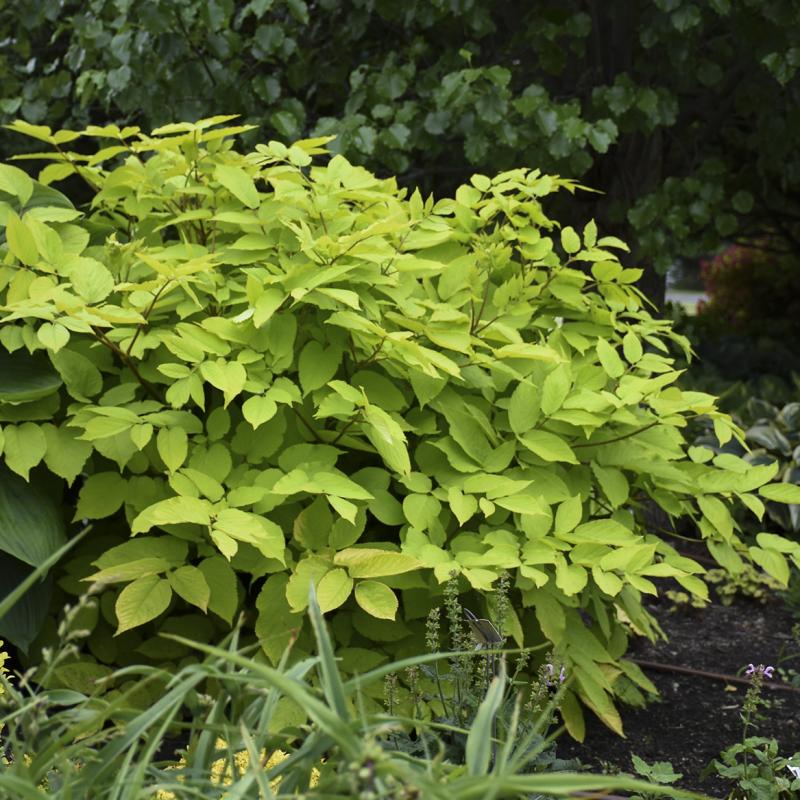 Vigorous and fast growing, this large shrub-like perennial is grown for its bright golden foliage that appears in early spring and lasts until fall. If too shady, leaves will be more lime-green. Tiny white flowers bloom late summer and form purple berries in fall.