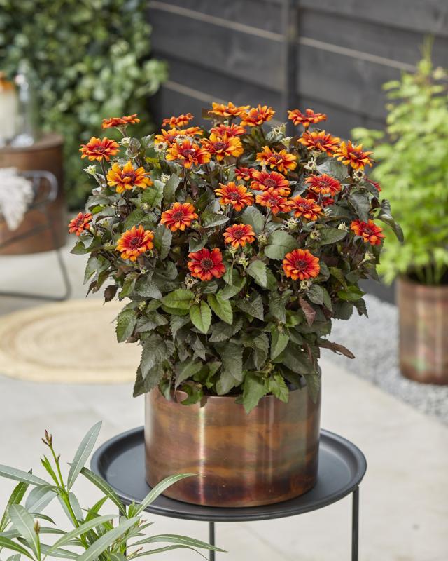 Dense, very dark foliage provides an attractive contrast to the yellow-orange to fire-red flowers that bloom from July to September, the shortest Sunflower on the market today. Very floriferous, compact and easy to maintain making this new variety excellent for pots, gardens or as cut flowers.