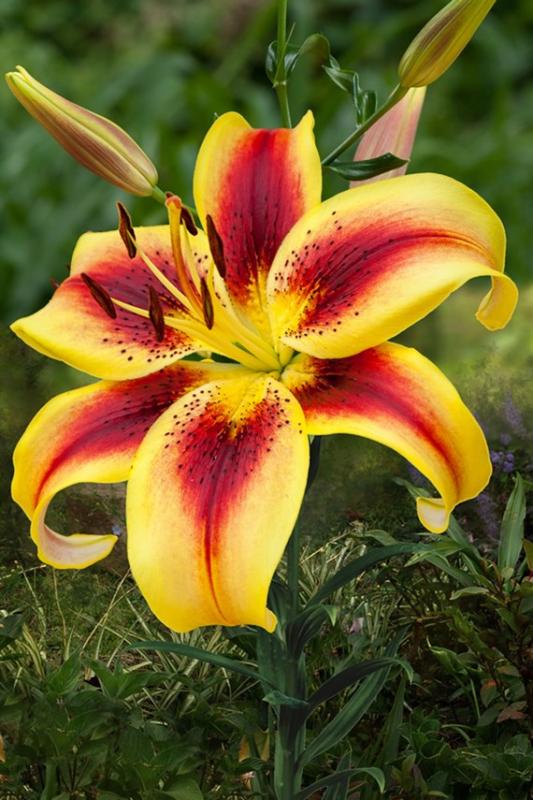 Huge 7" yellow flowers look tropical with red freckles and stripes; each petal is reflexed backward for an exotic look. Very fragrant. 3-5 buds per stem
