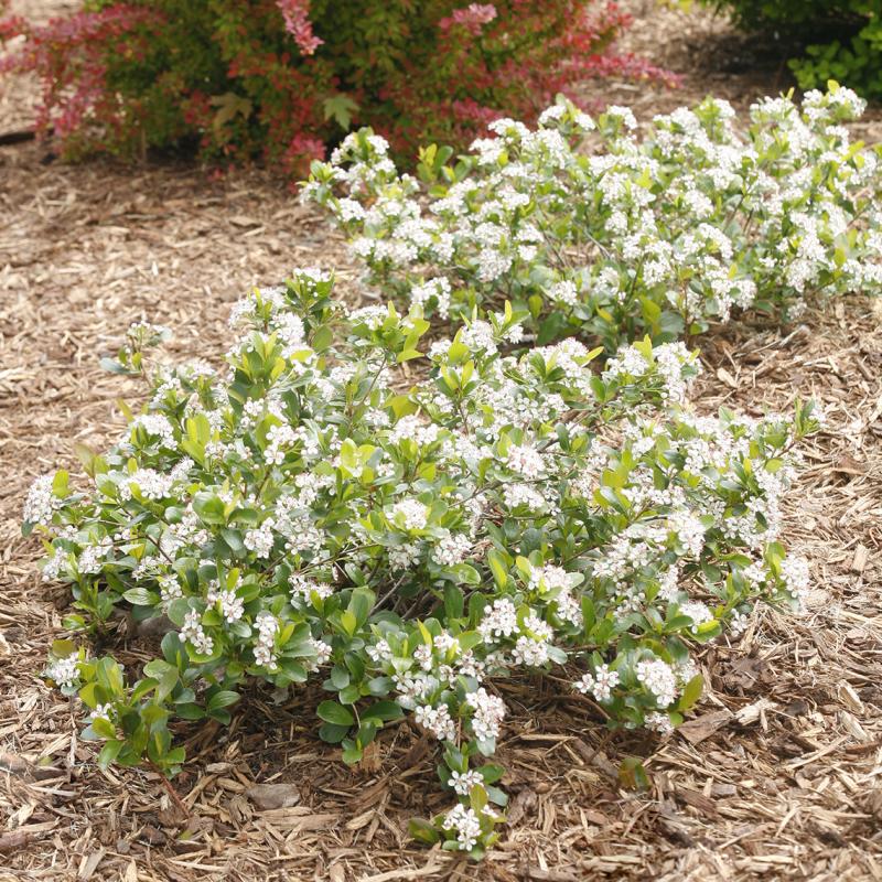 Low Scape Mound® Aronia is a tough, tolerant, tidy little mound of glossy green foliage. In spring, it's covered in hundreds of dainty white flowers, and in autumn, the leaves turn brilliant red to contrast with dark purple-black fruit. The unique low-growing, mound-shaped habit of this new variety makes it perfect for mass planting as a ground cover or edging plant.
