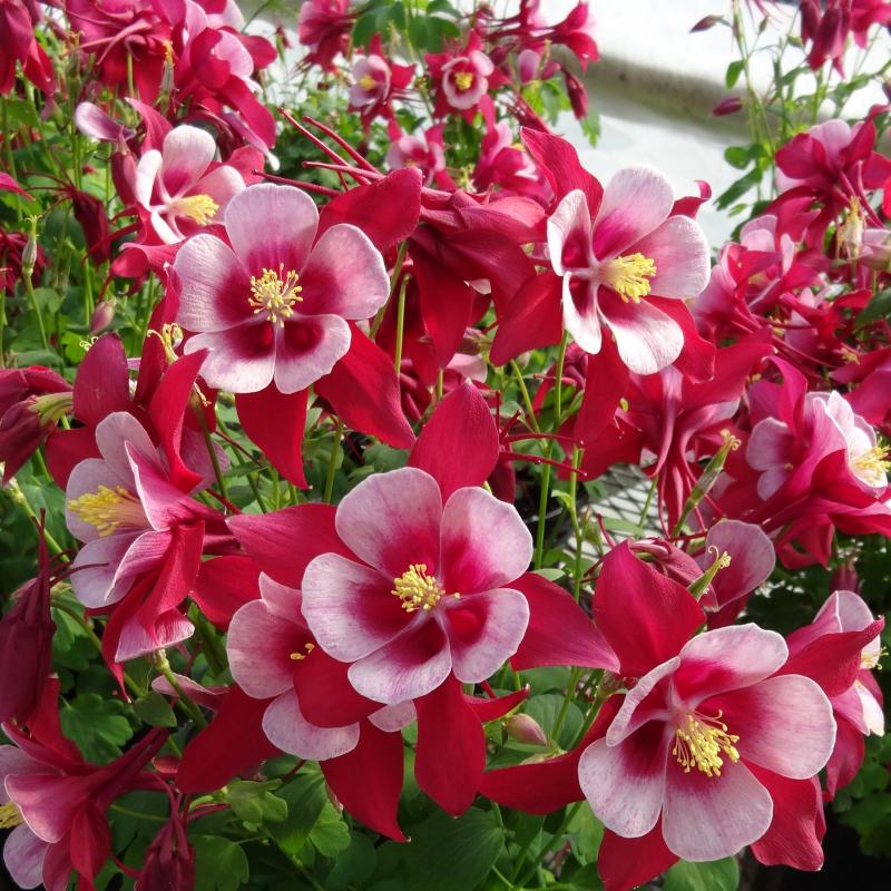 Large 3" red and white flowers with long attractive spurs, very showy and upward facing, long bloom time.