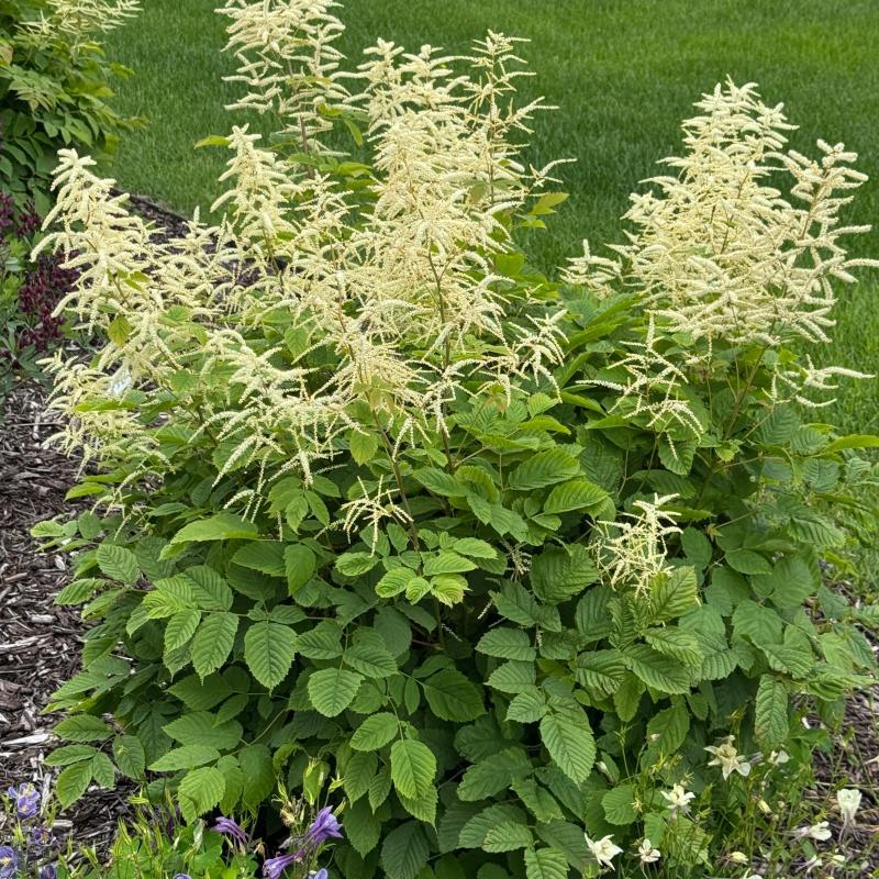 A giant astilbe-like plant; tall whispy plumes with cream-colored flowers bloom midsummer, grows best in moist semi-shaded areas.