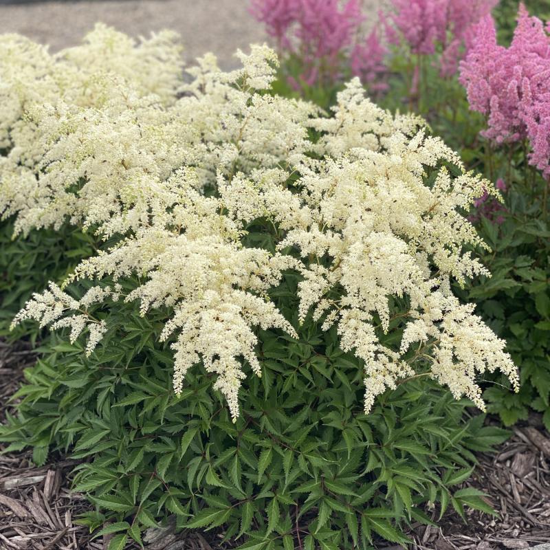 Generous amounts of arching white plumes bloom from mid to late summer on glossy, bronze-green dissected foliage.