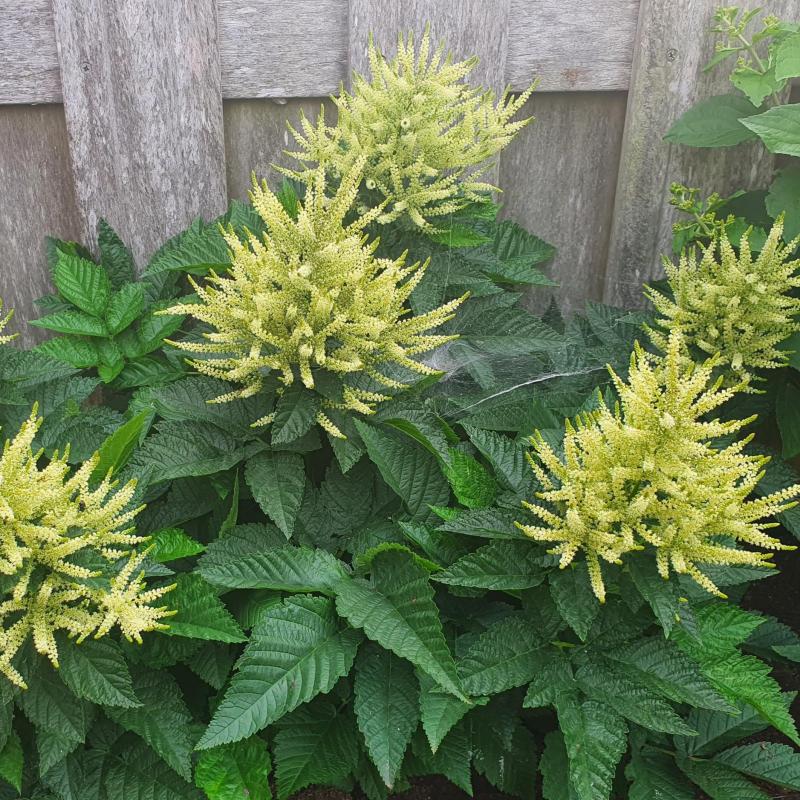 Compact, upright foliage with feathery creamy white plumes. Ridged, pinnate leaves turn from green to orange-red in fall.