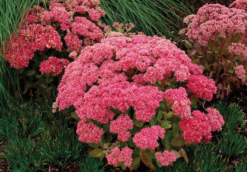 Upright clump form with spectacular purple-pink flowers. Smokey blue-green foliage and purple tinged stems form perfect compact clumps. Very strong stems remain upright.