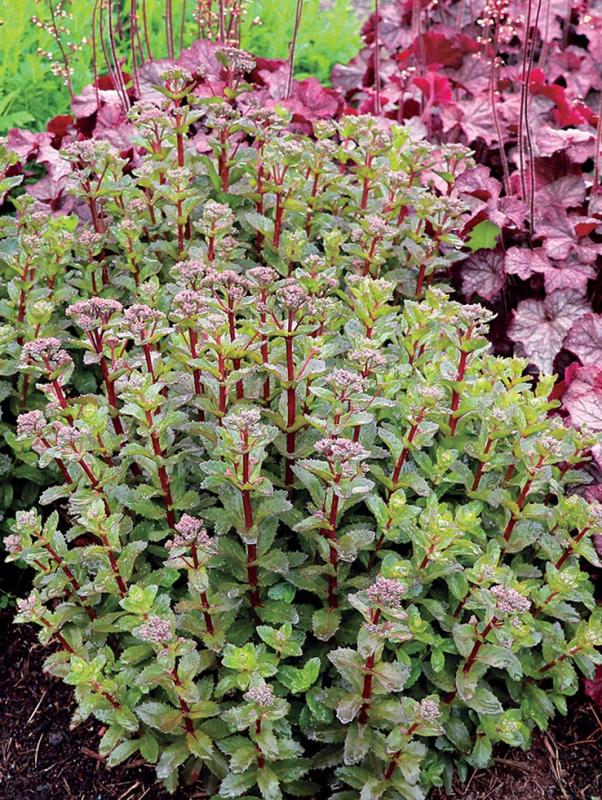 Double Martini's dark red stems really stand out against the olive green leaves that wrap around them. Pink flowers in fall top off the rounded growth habit. Drought resistant, easy to grow and tolerant of hot sun.