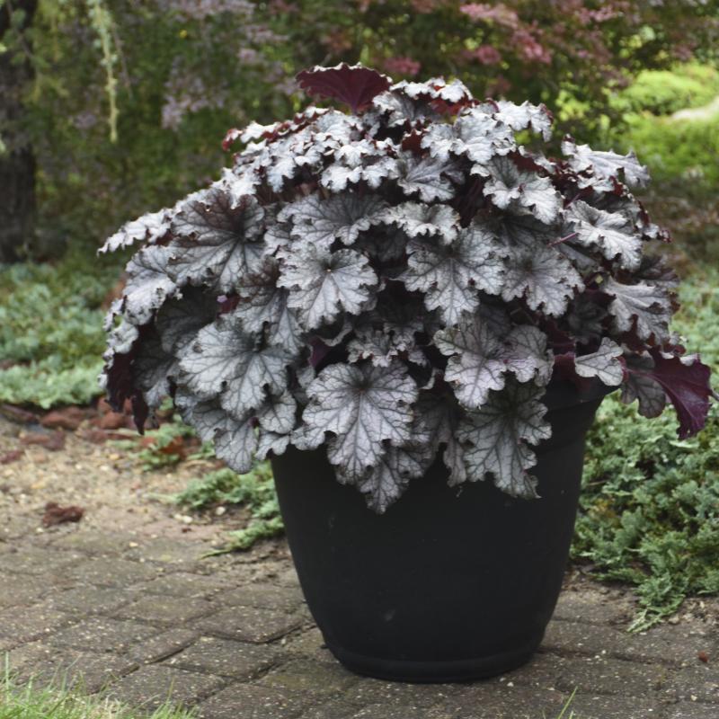 Each pewter leaf is heavily ruffled and accented with dark charcoal veins. The newest leaves are flushed with violet, matching the undersides of the leaf. The long-lasting foliage of Dressed UpĀ® 'Prom Dress' looks great through autumn.Try cutting a few of the tall flower scapes for fresh bouquets.