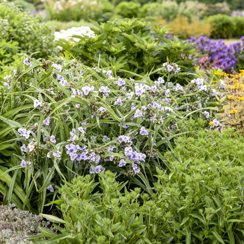 This bicolor Spiderwort showcases warm purple flowers with a soft lilac edge. The color transition on the petals almost appears to be airbrushed on. Flowers are large for Spiderwort at 2" wide. The long period of bloom is supported on a polished, compact habit of glaucous blue-green foliage.