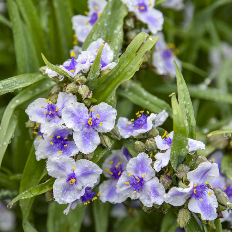 This bicolor Spiderwort showcases warm purple flowers with a soft lilac edge. The color transition on the petals almost appears to be airbrushed on. Flowers are large for Spiderwort at 2" wide. The long period of bloom is supported on a polished, compact habit of glaucous blue-green foliage.
