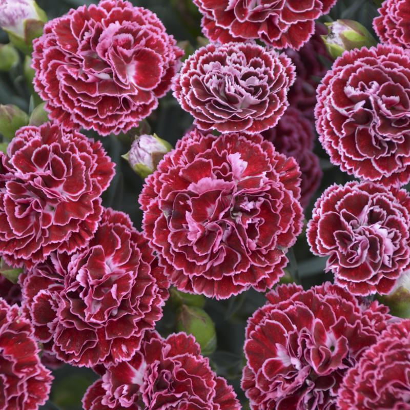 'Cherry Vanilla' has fully double, carnation-like flowers. 1½" wide, deep red flowers have a sharply contrasting, very light pink picotee edge that makes the color pop. The sweetly scented flowers appear proportionately above the narrow, blue-green foliage. Flowers appear in early summer, and a quick shearing after flowering will encourage them to rebloom in early fall.