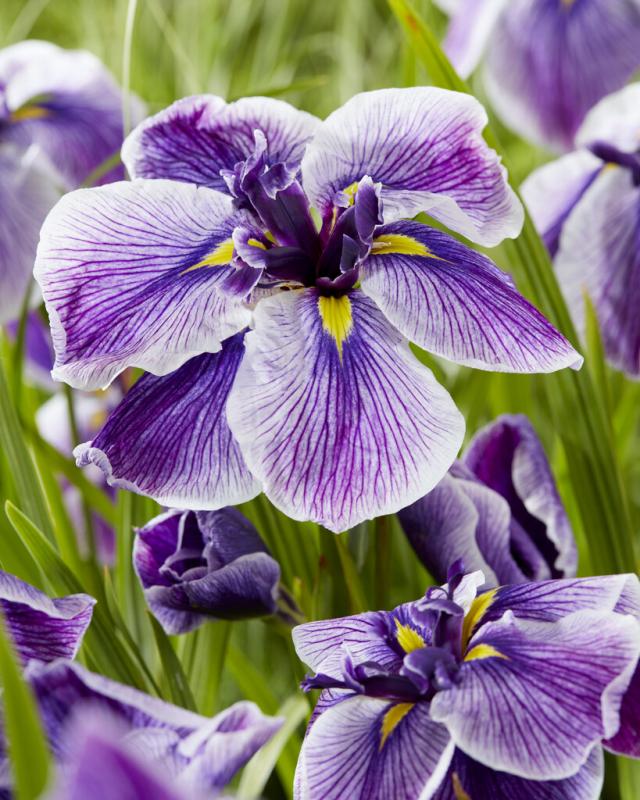 Huge lavender-purple veined flowers with yellow center, blooms early to mid-summer.