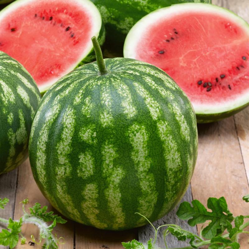 Ready to harvest in about 3 months. Classic round melons averaging 25 lbs. with light green and dark green stripes. Sweet, crispy fruit is deep red with few seeds. An easy crop to maintain - just keep watered and in full sun until harvest!
