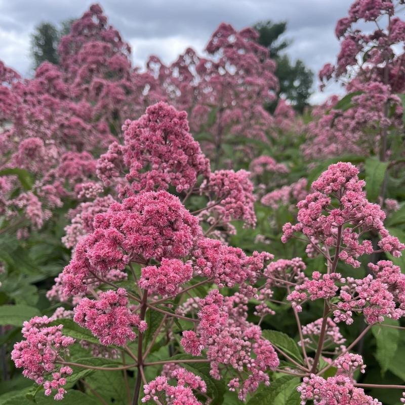 More compact and brighter flowers than other Joe Pye Weed. Dome-shaped clusters of double, vibrant pink flowers bloom from early July to hard frost, stems are dark maroon at maturity.