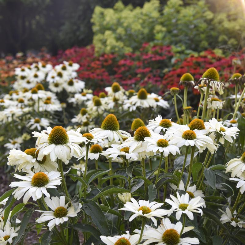 Very wide, overlapping, horizontal white petals with a green cone and yellow pollen. Flowers are 5" wide and held overtop dark green foliage. Praised for their cheerful brightly colored flowers, coneflowers are a mainstay in today's garden. Be sure to leave some spent blooms on the plants in the fall because their seeds provide winter food for finches and other birds. The dried seed heads also provide architectural interest in the winter.