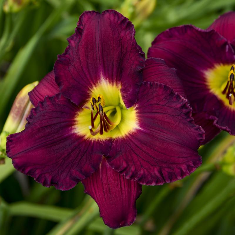 Similar to the highly regarded daylily ‘Bela Lugosi’, this variety offers a shorter height, fragrant blossoms, and more prominent veining in the oval shaped petals.  Large 6”, shimmering dark purple, very sunfast flowers with a chartreuse throat and pie crust ruffled petals are produced midseason.  A high bud count on well-branched scapes ensures many weeks of bloom.