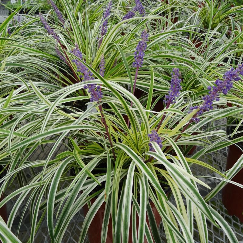 Forms attractive tufted clumps of green and cream variegated foliage. Short spikes of violet-blue flowers bloom late summer through fall.