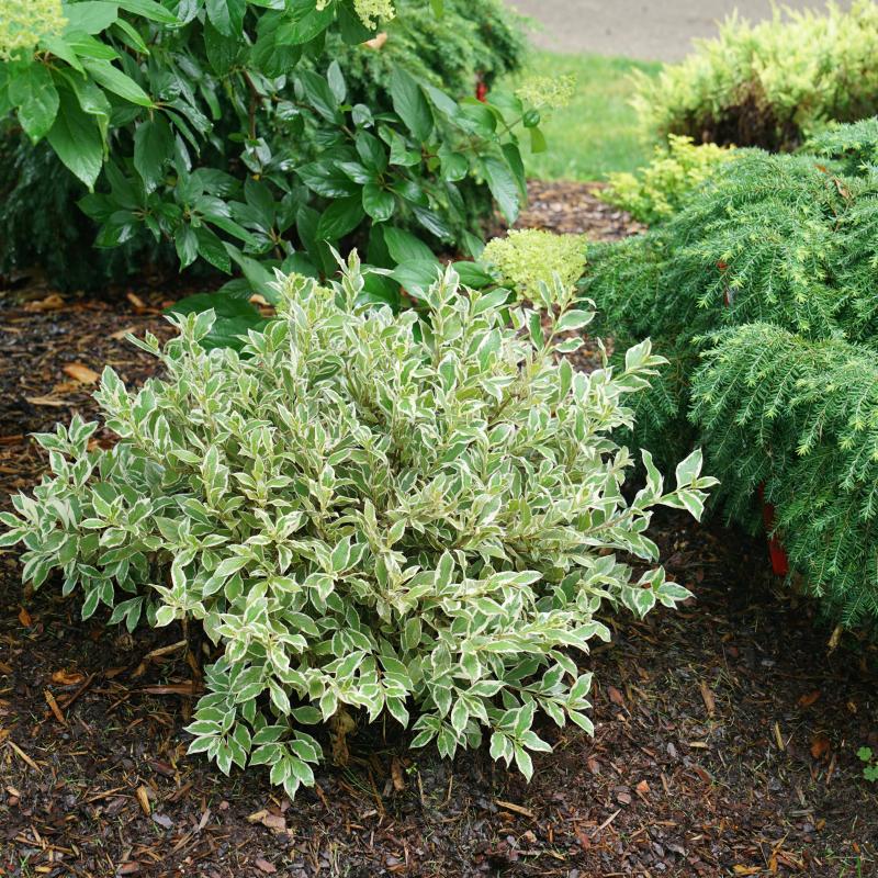 Its variegated cream and mint green foliage takes on purple (as opposed to pink) tones. Though it is slightly larger, it can be used as a delightful companion to perennials, as a colorful edging, in a container, or anywhere you need a spot of clear, clean color.
