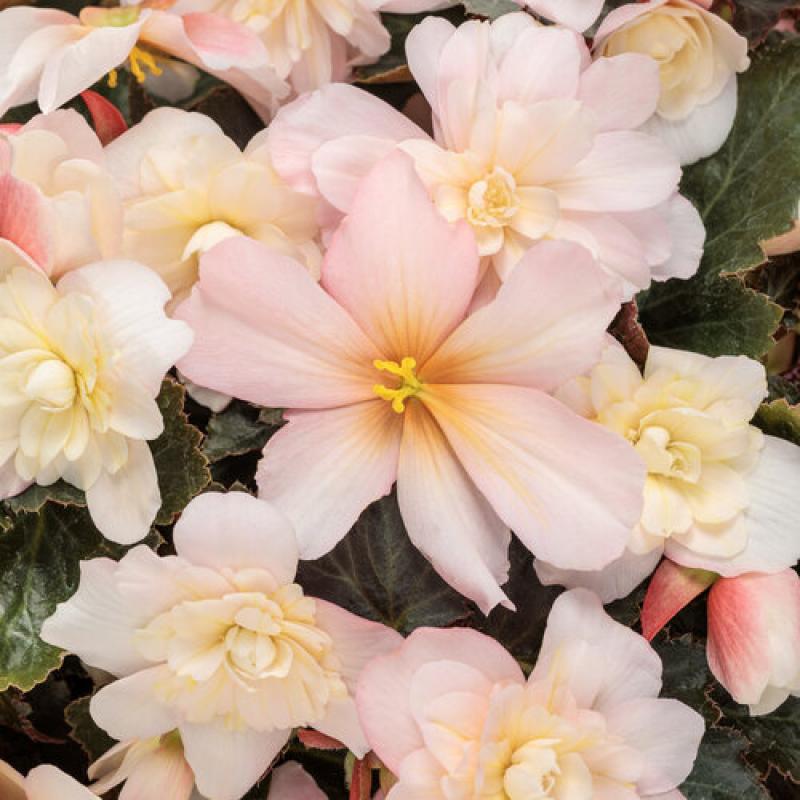 Double Delight Appleblossom begonia exudes a sweet citrus-like fragrance from its large, abundant, white and soft pink bicolor blossoms on cascading stems. Increased sun tolerance makes this begonia versatile for use in containers, hanging baskets, window boxes and monoculture containers.