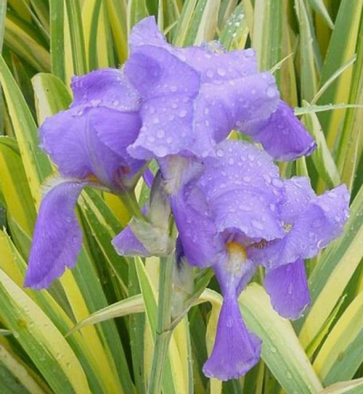 Green and yellow striped foliage under very fragrant lavender-blue flowers.