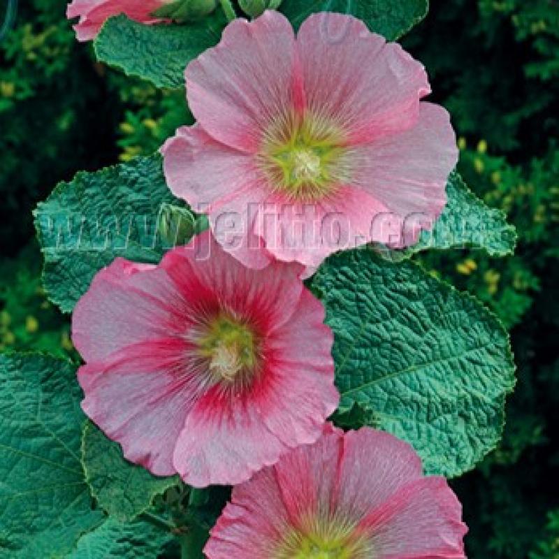True perennial hollyhock which flowers the first year from seed, brilliant pink single flowers bloom on tall stately stalks all summer; pinch to produce more compact and bushy plants.