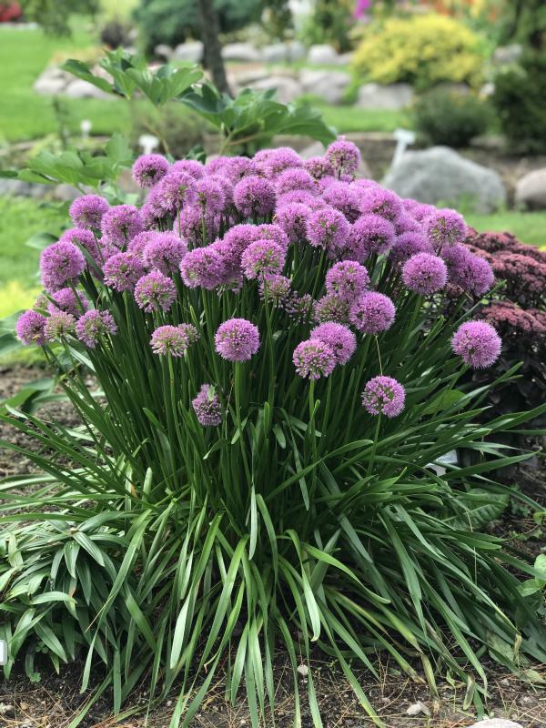 This fool proof variety of allium is clump forming and produces sterile seed that will not spread, purple-pink flowers appear in late summer and are held above green grass-like foliage, excellent deer and rabbit resistance.