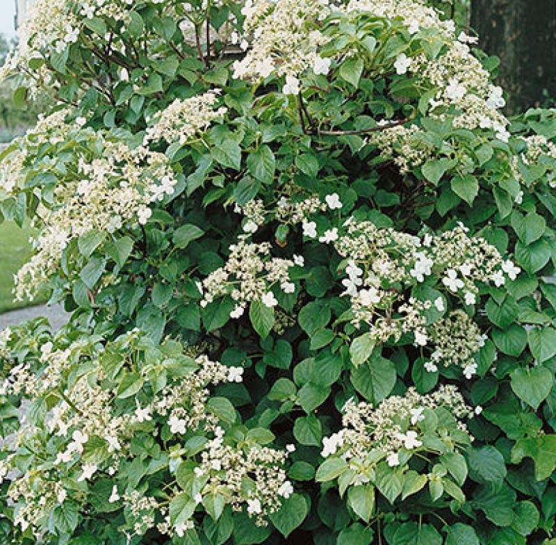 One of the best vines for clinging to brick or stone walls. The white flowers are produced in flat-topped corymbs in late June or early July, 6-10" in diameter with a sweet fragrance. Does well in sun or shade. Blooms on old and new wood.