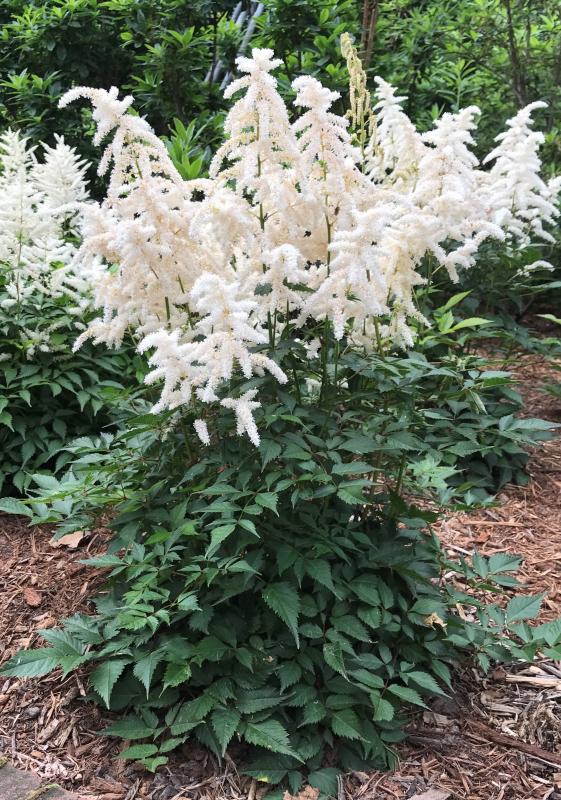 Early season bloomer; dark green foliage, under open plumes of creamy white flowers; medium sized plants are good for pots