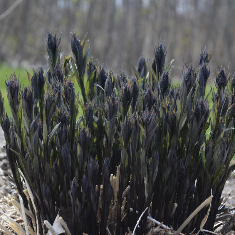 In spring, new stems emerge near-black with leaves that are very dark green with silver veins. The stems stay dark throughout spring. Light periwinkle blue, star-shaped flowers completely cover the foliage in late spring, and rebloom for many weeks afterward. Although the main interest of this plant is in spring, it maintains a great garden presence throughout the summer and fall. Its wide, mounded habit lends itself well to be used in place of shrubs in the landscape.