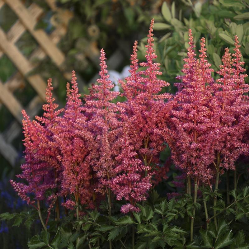 Large 8" long, hot pink, pyramidal plumes on very strong flower stems that do not require any staking. 'Rise and Shine' blooms midsummer.