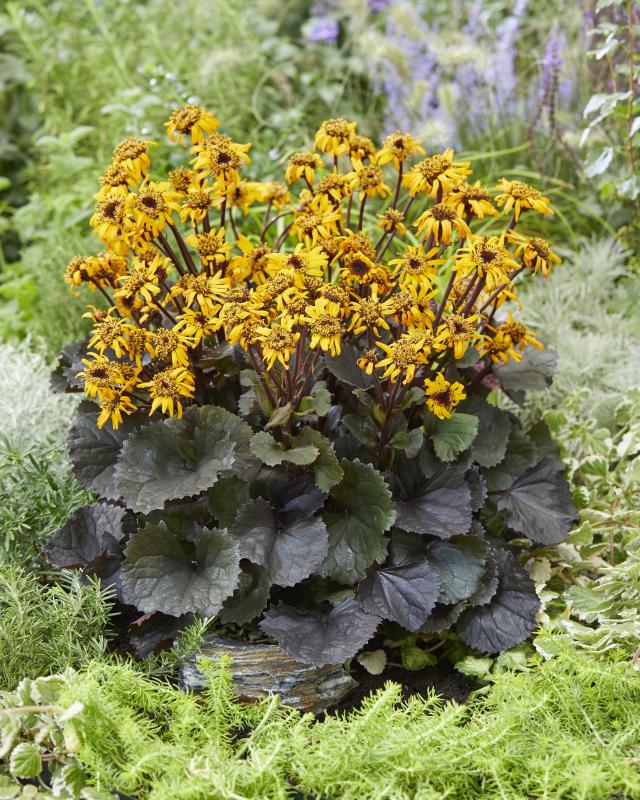 A dense, compact clump of broad, glossy, wine-red to chocolate brown foliage that showcases large, golden-yellow, daisy-like flowers on bright garnet-red, thick stems; evergreen in warmer winter regions. Grows well in damp areas; exceptional in containers.