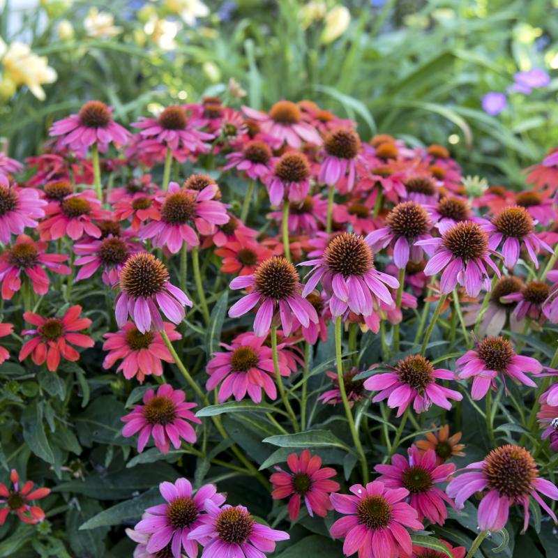 This seed strain shows a variety of beautiful shades of red, varying from reddish-orange to pinkish red. Each 3½" flower has horizontal petals. With a shorter stature, it is a great fit for the front of the border, small spaces, and combination containers. Just like other Coneflowers, this will bloom nearly all summer long, all the way up to frost.